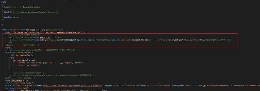 1. 修改 tpl/content-single.php 文章模板,将下图中的内容注释掉即可,否则文章将会出现两个标题