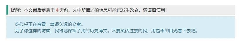 echo '<div class="old-message">提醒:本文最后更新于 <a><strong>' . $daynum . '</strong></a> 天前,其中某些信息可能已经过时,请谨慎使用!</div><div class="expired-message">你似乎正在查看一篇很久远的文章。<br>为了你这样的访客,我特地保留了我的历史博文。不要笑话过去的我,用温柔的目光看下去吧。</div>';