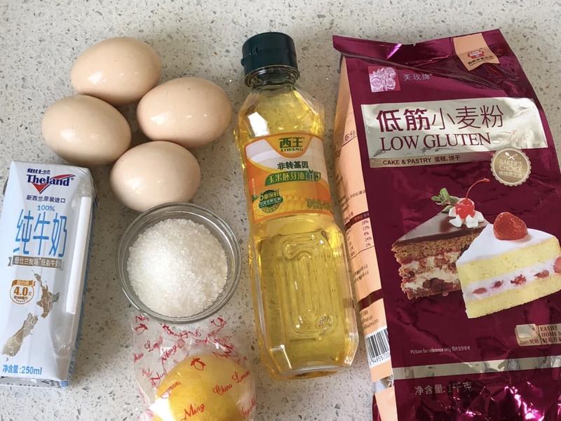 准备材料,戚风蛋糕材料很简单,新鲜的洋鸡蛋、细砂糖、纯牛奶、低筋面粉、玉米油。还有柠檬汁、香草精,没有可以不放。(称量了一下3个洋鸡蛋175g参考下)