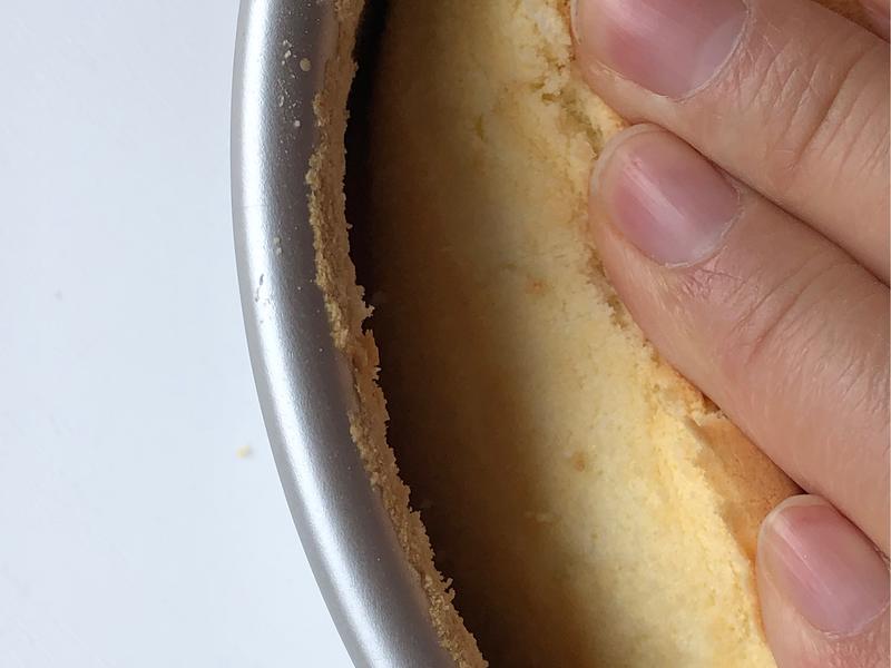 关于脱模:2小时后戚风蛋糕完全冷却后用手按压蛋糕边缘一整圈使蛋糕体与模具壁脱离。