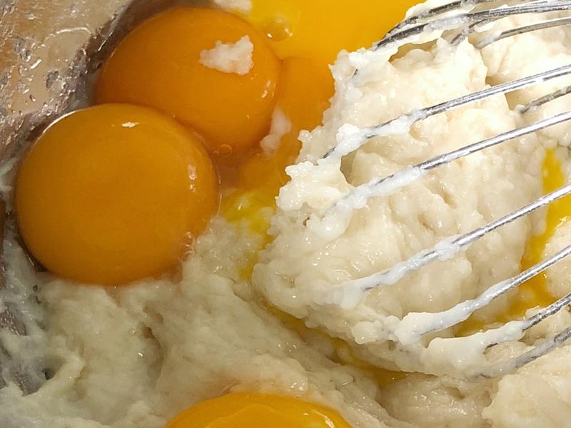 蛋黄分次加进去,用蛋抽一字形搅拌均匀,最后拌出来的面糊是细腻顺滑的,蛋黄糊就完成了。