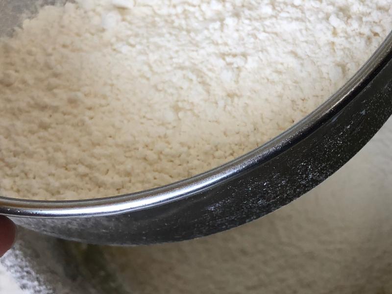 筛入称量好的低筋面粉(8寸配方里玉米淀粉和低筋面粉一起过筛) 用刮刀划Z形搅拌均匀至没有面粉颗粒。千万不要画圈搅拌‼️ 避免面粉起筋。