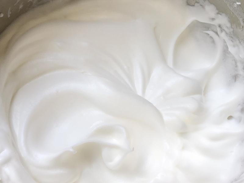 当蛋白开始有纹路且不会马上消失时,加入剩下的细砂糖,调至5档或6档,打发到“硬性发泡”状态‼️也就是9分发,拉起打蛋头可以拉出直立的蛋白尖‼️不会弯曲(稍稍弯曲应该也可以) 打发蛋白一定要到位,可以倒扣打蛋盆蛋白不流动。蛋白霜状态是很细腻有光泽的,如果粗糙就是打过头了。