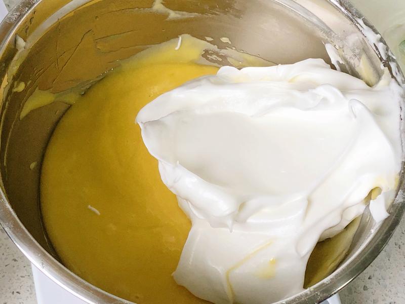 蛋白打好了,面糊制作过程不能消泡,先取1/3蛋白霜倒入蛋黄糊翻拌均匀。