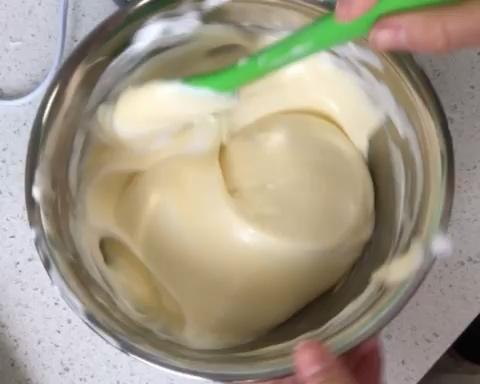 将混合好的蛋白霜与蛋黄糊再倒回盛有蛋白霜的打蛋盆内,继续翻拌均匀。 翻拌手法:以不规则方向用刮刀切拌均匀,再翻拌均匀,翻拌过程刮刀从中间处划入,抄起底部,左手转动蛋盆,刮刀从下往上往盆边提起,不断重复,直到戚风面糊拌匀至看不见白色的蛋白霜为止,拌好的面糊质地是细腻的。(拍了视频)