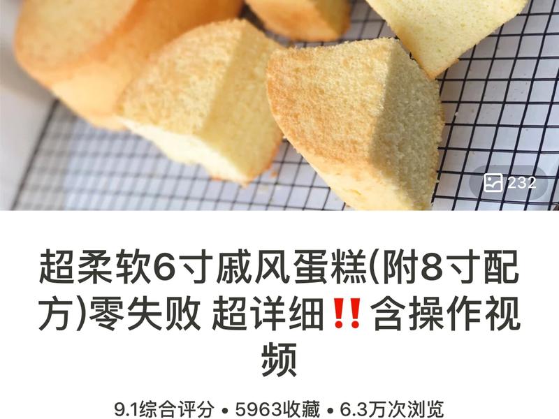 戚风松软好吃成功记得交作业的时候点“好极了”谢谢,之前是9.1分的菜谱,很用心写的菜谱,给个好评谢谢❤️