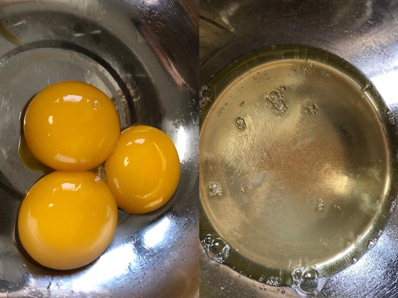 分离蛋黄、蛋清至两个容器中,蛋清里不能混入蛋黄‼️蛋清倒入干净无水无油的打蛋盆中冷藏备用。(分离时最好用小碗先一个个地分,再倒入大碗中,以免坏鸡蛋或蛋黄打散导致其他蛋白蛋黄都不能用。)