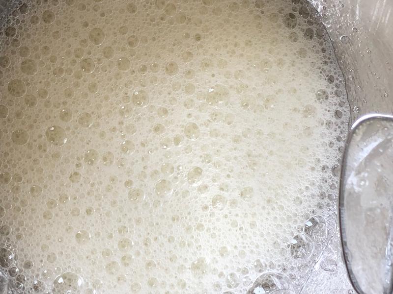 接下来开始打发蛋清,冰箱里取出蛋清,加入柠檬汁或白醋,用电动打蛋器4档(中速档)打发蛋清,打发至现在大泡泡鱼眼状粗泡时,加入1/3细砂糖。